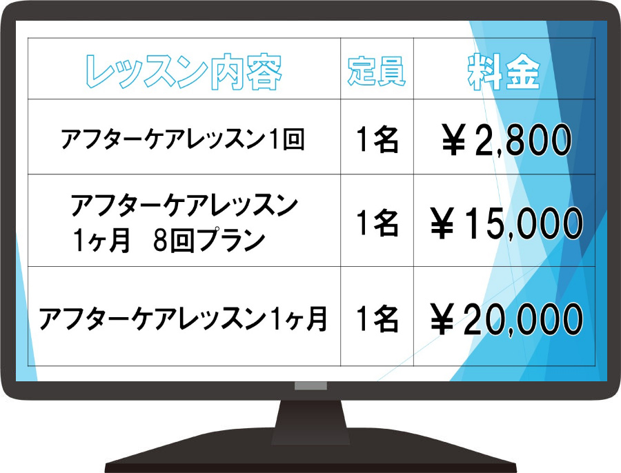 7/1より事業拡大の為、アフターケアレッスンのお値段の改定をさせて頂きます。